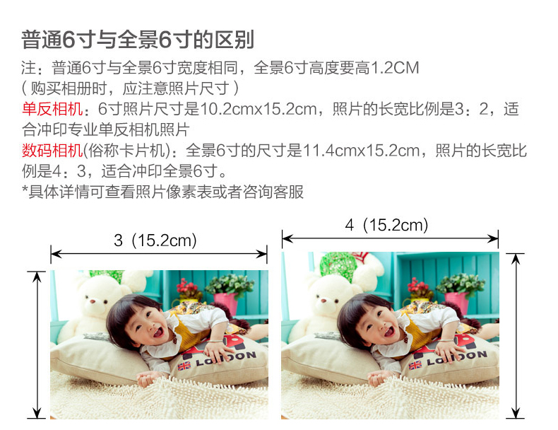 答:亲,这只是不同的尺寸而已, 大6寸比较6寸会稍微大一点,6寸是15.2*10.2cm,大6寸是15.2cm*11.4cm。(注意3寸,4寸为特定尺寸,为保证全景画面会稍留白边) |