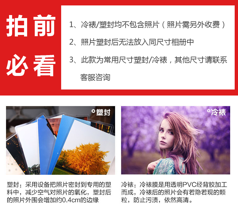 优 惠:5寸照片塑封0.5元,其他尺寸请咨询客服